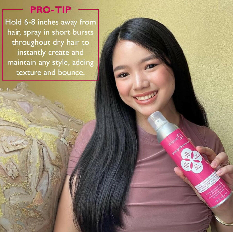 Everything Spray es un potente spray que ofrece a los usuarios cuatro opciones de peinado y un cabello perfecto sin complicaciones en un solo producto. Refresca tu cabello con este spray seco variable enriquecido con ingredientes de doble acción que absorben la grasa y limpian. Mantén tu cabello con un aspecto abundante y fresco entre lavados. Se absorbe en las raíces para limpiarlo. El potenciador del peinado ofrece un acabado definido y duradero.